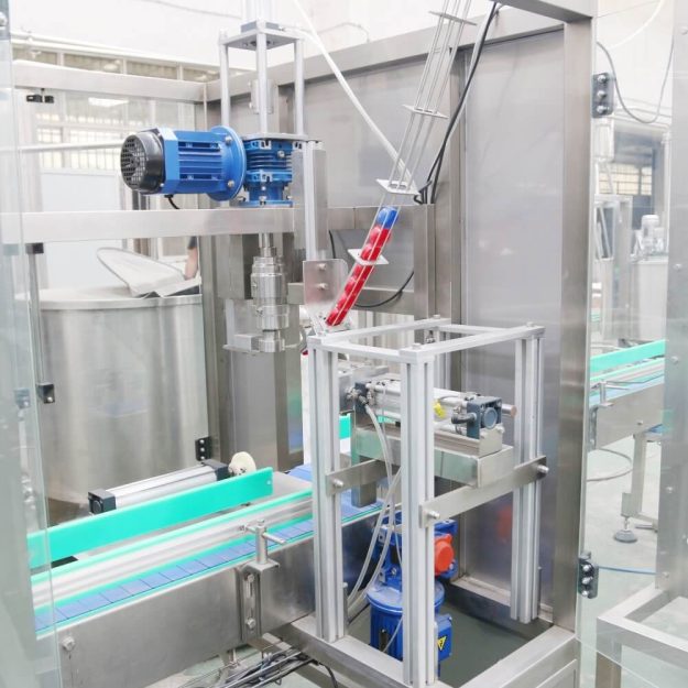 The rinsing unit uses a linear bottle neck-holding mechanism that ensures stable bottle positioning without damaging PET bottles. With stainless steel grippers and internal spraying nozzles, each bottle is flushed with purified water to remove dust and contaminants. The system includes a closed-loop rinse water recovery feature to reduce water consumption — ideal for operations that emphasize hygiene and sustainability.