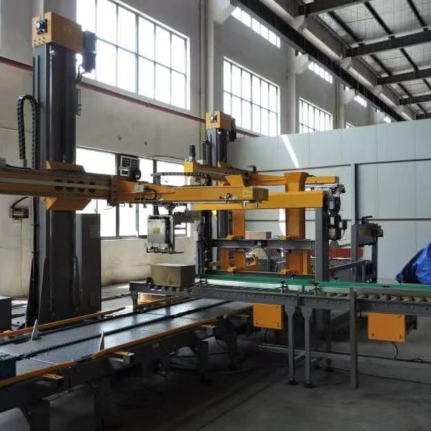 Сервопаллетайзер используется для укладки картонных коробок или продуктов, обернутых пленкой, на поддоны в определенном порядке, а затем для их автоматической укладки в штабеля. Он может укладывать несколько слоев, а затем выталкивать их для транспортировки вилочным погрузчиком на склад для хранения. Это оборудование использует управление PLC + сенсорный экран для обеспечения интеллектуальной работы и управления, которое простое и легко осваивается. Оно может значительно сократить количество рабочих и снизить интенсивность труда. Оно может переключаться между различными продуктами и типами поддонов без добавления сменных деталей и подходит для паллетирования пленочных упаковок, картонных коробок, оборотных ящиков и других продуктов.