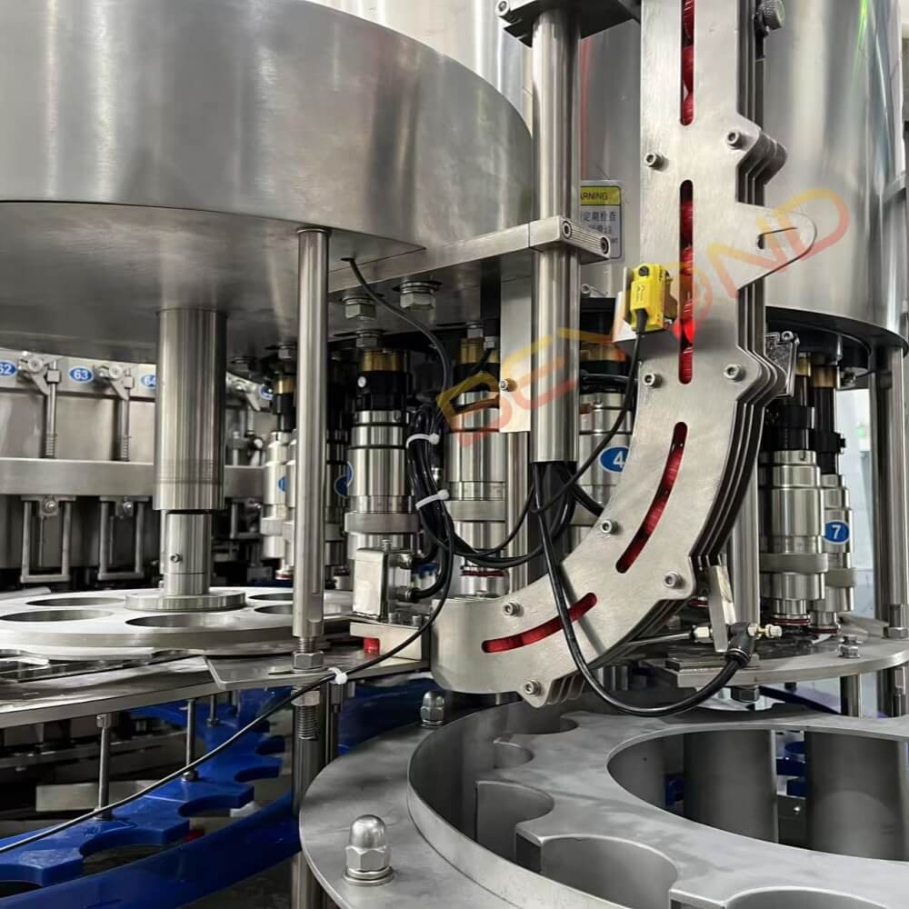 The filling of carbonated beverages is accomplished using counter-pressure filling machines. These specialized machines fill bottles while carefully regulating internal pressure to prevent the escape of carbon dioxide (CO₂). To minimize foam production and ensure maximum carbonation retention, filling is typically conducted from the bottom or side of the bottles.